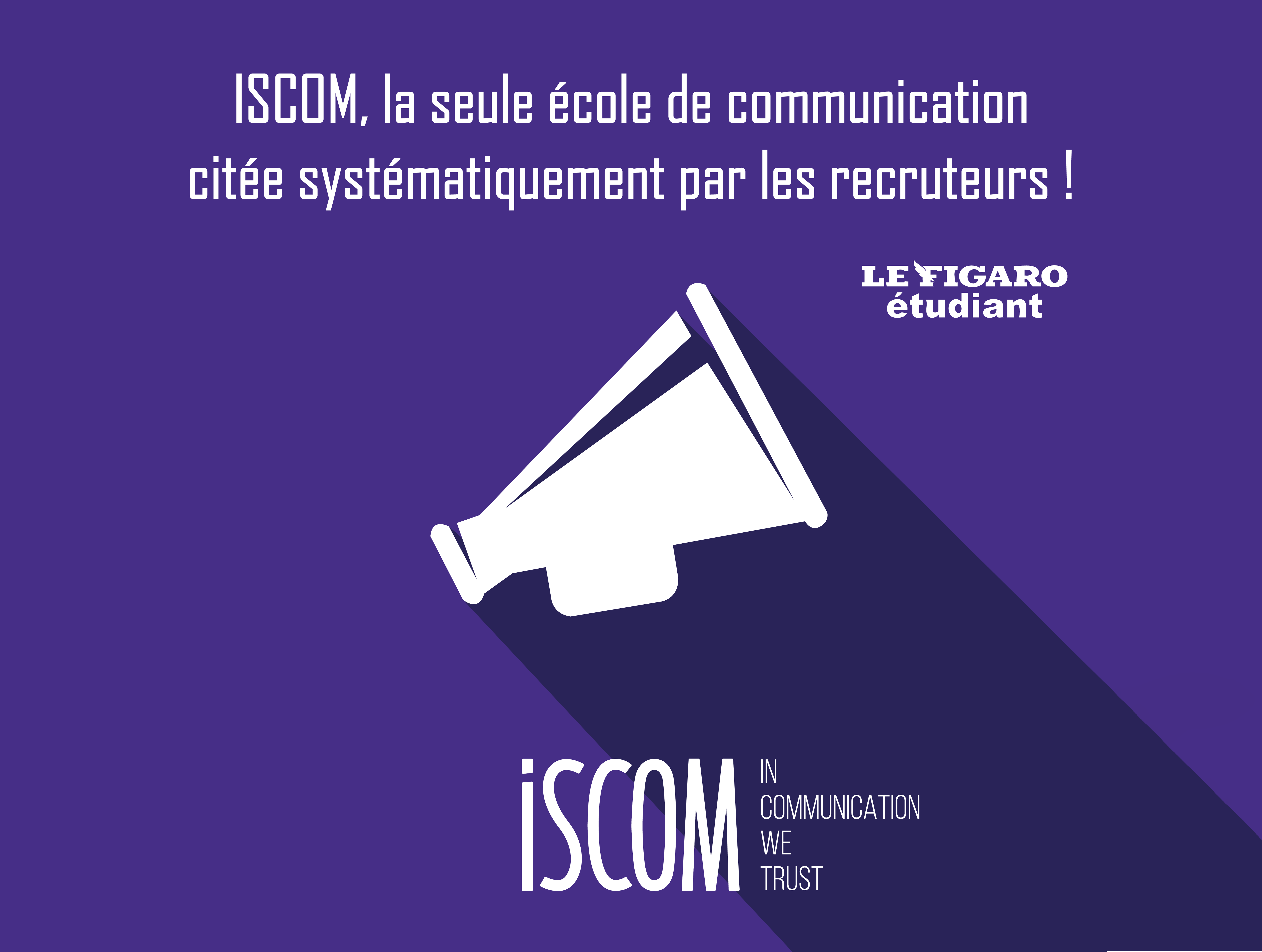 Les plus grandes agences de communication, de publicité et d’événementiel nous font confiance. Pour elles, l’ISCOM est synonyme de qualité et d’efficacité. Dans une enquête récente du Figaro Étudiant, nous sommes la seule école de communication citée systématiquement par les recruteurs. C’est un témoignage de notre engagement à offrir une formation complète sur les métiers de la communication, où la théorie rencontre la pratique et où chaque étudiant acquiert des compétences directement utiles en entreprise. Nous avons conçu notre pédagogie pour qu’elle réponde précisément aux besoins du marché de l'emploi : les étudiants diplômés de l'ISCOM sont prêts à intégrer les plus grandes équipes, avec des savoir-faire solides et adaptés aux exigences et à la concurrence du secteur.